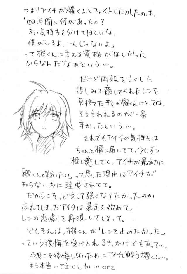 櫂がアイチを導くワンサイドゲームじゃなくて、アイチが櫂を癒してもいるクロスカウンターストーリーだったという。こういう言い方すると少年漫画っぽい(笑)